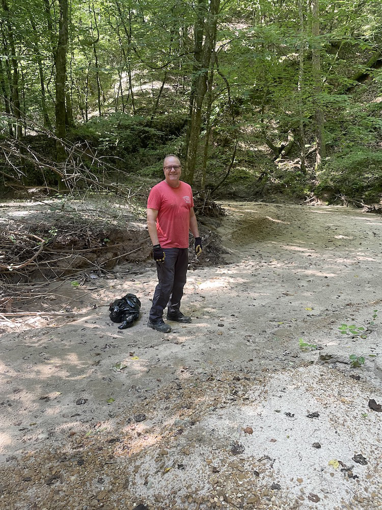Carey King, one of Saturday’s work crew, stands on a sandbar in Tunica Hills WMA with a loess bluff behind him. Photo by Amber King.