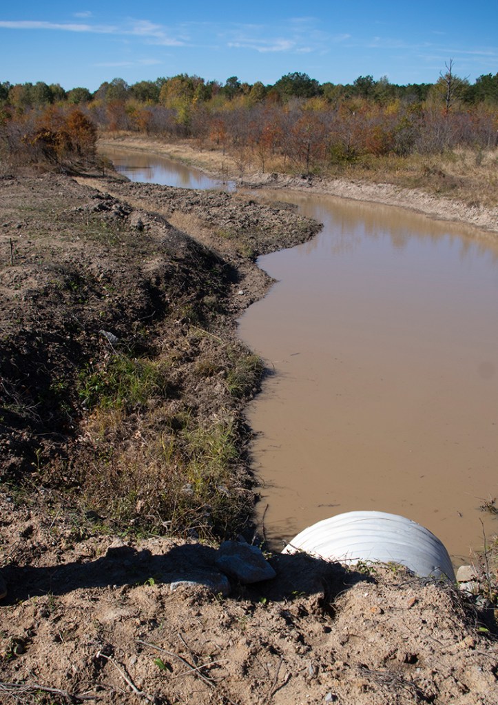 Of course, they had begun by bulldozing thousands of trees–bottomland hardwoods–into huge windrows and burning them. And they scraped the entire 19,000 acres as flat as they could, destroying all of the natural plumbing–streams, bayous, sloughs–by moving dirt.