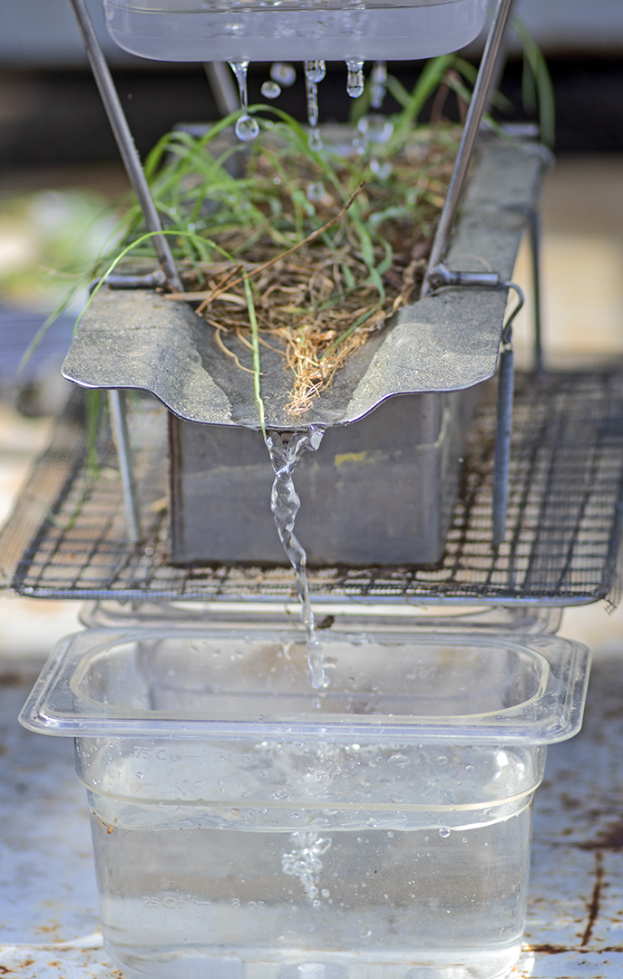 Runoff from soil with plants is virtually clear (left image); runoff from bare soil is muddy and full of sediment (right image).