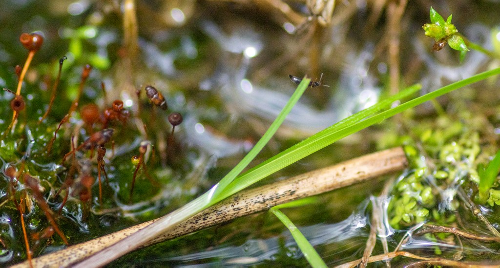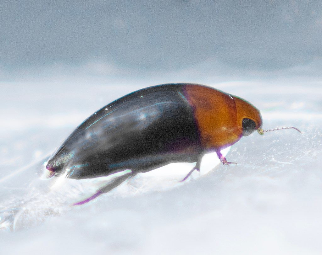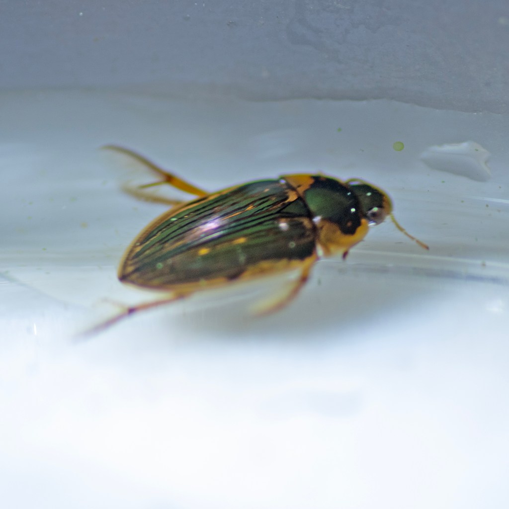 Our nets yielded a multitude of grass shrimp and water beetles, plus a few water mites, isopods, and other critters. Again with the help of the fiber optic light, I was able to get good enough photos of two of the beetles for them to be conclusively identified at species level on iNaturalist. Too cool! BTW, these full-macro photos are deceiving. These guys are tiny: black dots swimming around in your collecting bucket.