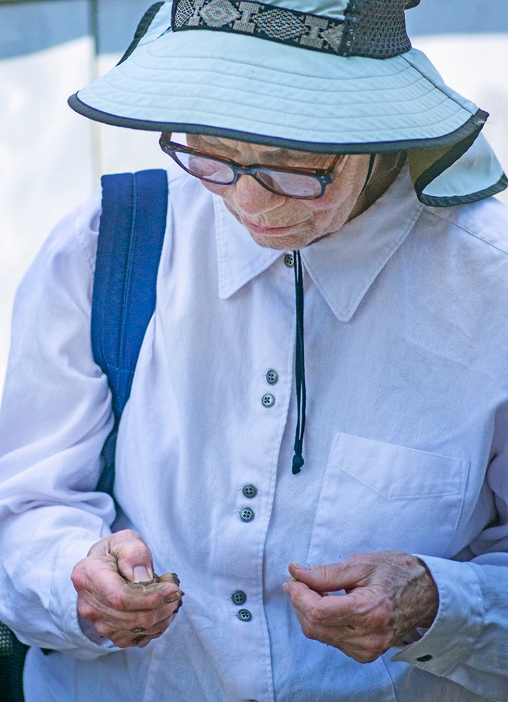 Anne Frazer focuses on evaluating the texture of the ball of mud in her hand.