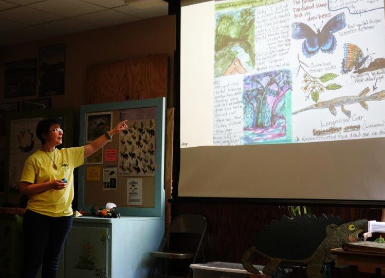 Kim Paxton illustrated her talk on nature journaling with photographs of pages from Amy Ouchley’s nature journalis, as well as from her own. Photo by Charles Paxton.